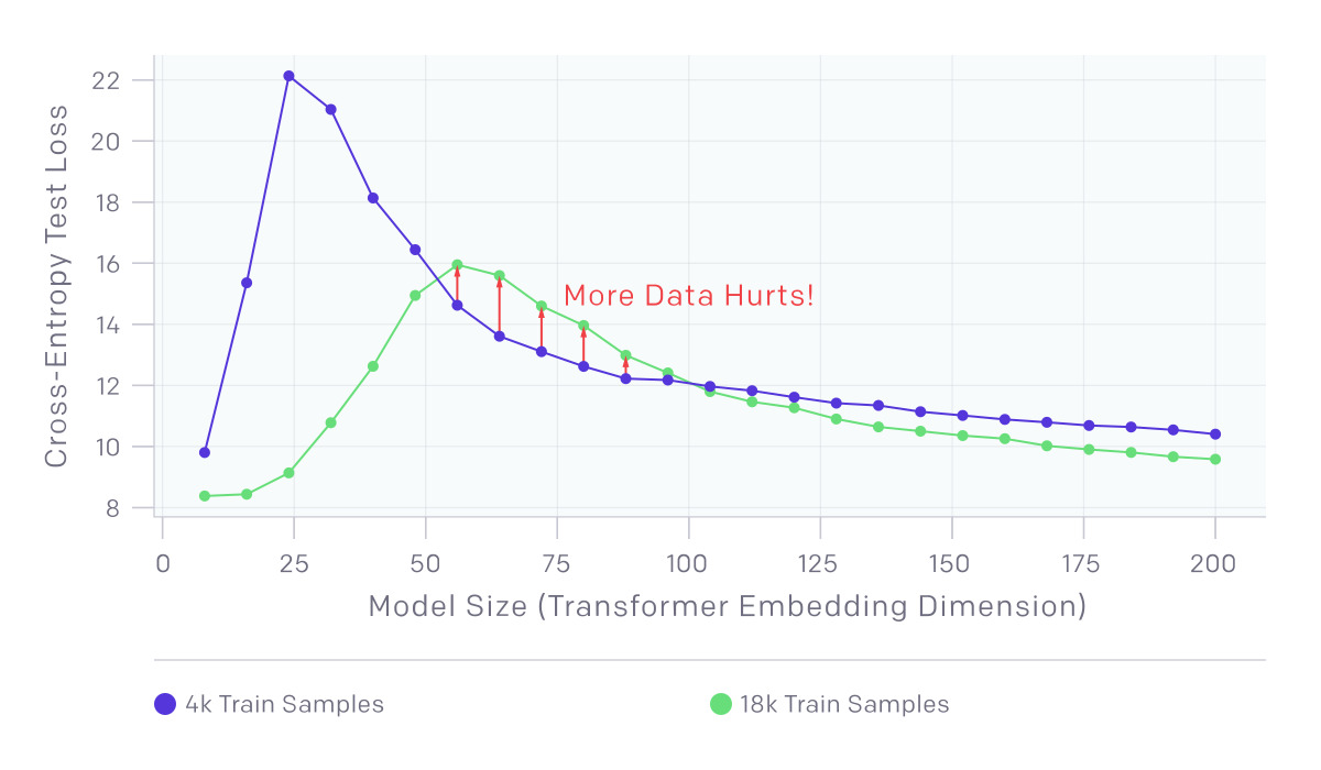 위는 트랜스포머를 라벨노이즈 없이 학습했을때의 차트인데, 18k trainset의 test ce loss가 더 높은 구간이 존재한다.