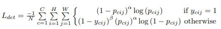 1, Ldet : focal loss의 변형이다. heatmap에 기여. p는 해당 위치에서의 score, y는 ground-truth이다. N은 image에서 object의 수, alpha(2), beta(4)는 각 point의 기여도를 조절하는 hyperparameter