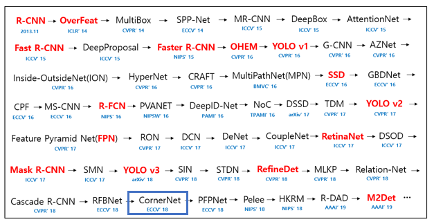 CornerNet은 1-stage 계열에서 새로운 방식으로 등장한 object detector이다.