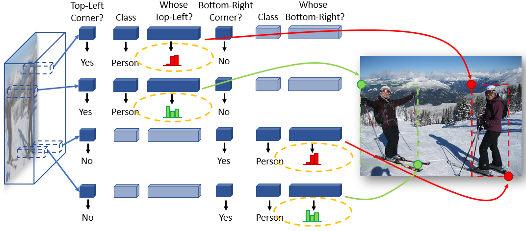 1. bounding box를 pair corner point로 찾고 각각의 포인트의 embedding을 통해 pair를 구성한다. 100k에 이르는 anchor box가 필요하지 않다