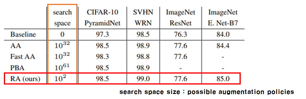 - 그러므로 이전 AA나 FAA, PBA등에서 operation 및 prob. ,magnitude 까지 결정하기 위해 search space가 매우 컸다는 점을 생각해보면 매우 단순해진 형태입니다.