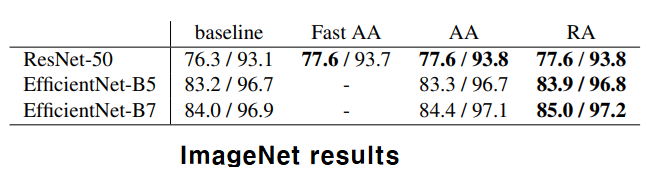 - RA가 여전히 제일 우수한 성능을 보여줍니다. CutOut도 ImageNet 실험을 수행했으나 성능향상엔 실패했다고 합니다.