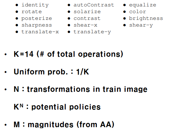 쉽게 얘기하면 본 논문은 데이터셋이 크거나 모델사이즈가 큰 경우 augment의 함수(rotate, shear 등과 같은 operation)와 상관 없이 각 함수의 normalized 된 magnitude를 조절하면서 최적값을 간단히 찾을 수 있는 방법에 대해서 소개합니다.