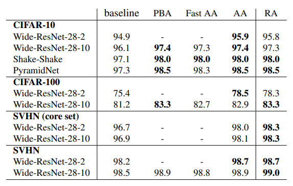 AA, FAA는 위에서 소개드렸고, PBA는 Population Based Augment(ICML19, 19.05)로서 유전 알고리즘을 이용한 최적화로 augment 함수를 최적화 하는 기법입니다.