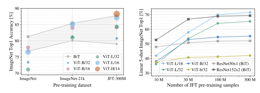 기존 vision task에서 pretrain 으로 많이 사용하던 ImageNet은 transformer 기준으로 본다면 중규모 데이터셋에 불과하다. 실험에서는 ImageNet(100만)을 포함하여 구글 내부용 데이터셋인 JFT-300M(1400만 랜덤샘플링, 3억)을 이용하여 결과를 냈다.