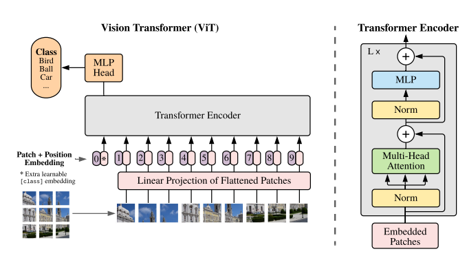 ViT에는 P x P 크기의 patch 하나하나가 바로 단어가 되는 셈이다. 다만 그냥 생각해 봤을 때 단어 사전이 존재하는 자연어 분야 대비 그런 것이 없는 image patch는 경우의 수가 많을 것으로 생각해볼 수 있다.