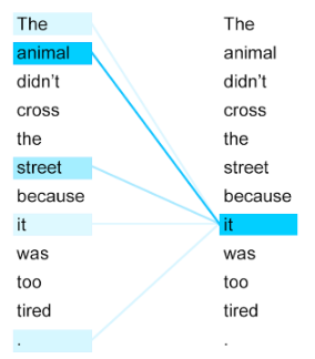 위 예를 보면 우측의 it은 좌측의 모든 단어들과 match해서 유사도를 계산한다. 그래서 가장 연관성이 높은 단어에 대해서 높은 유사도를 가지게끔 학습을 한다.