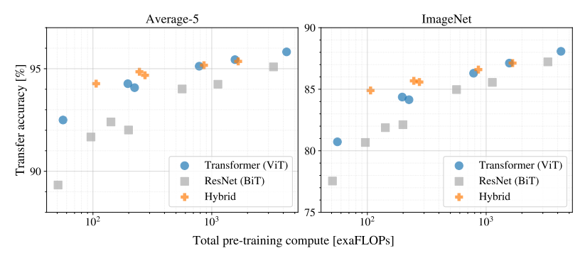 전반저긍로 ResNet(BiT)의 성능이 낮은 것을 알 수 있다. 같은 연산일 때 ViT가 BiT를 앞선다. 여기서의 포인트는 ViT와 Hybrid ViT의 비교인데 Hybrid 가 비슷한 정확도에서 더 적은 연산을 요구하는 것으로 보인다. 저자들은 CNN은 필요 없다는 듯한 태도를 보이면서도 hybrid 방식에 대한 실험결과를 남겼다. x축이 커질수록 gap이 줄어든다.