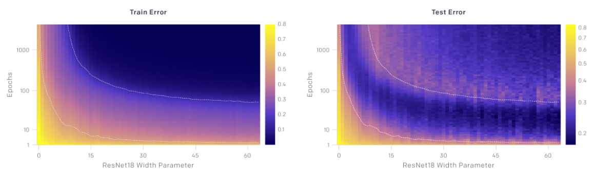 주목할 곳은 우측 차트인데, 대략 7 이상의 width parameter 에서 epoch을 진행시켜 위로 이동하다 보면 train error와 달리 test error가 어두운 보라색이다가 다시 밝은 보라색으로 변경되는 현상이 발생한다.