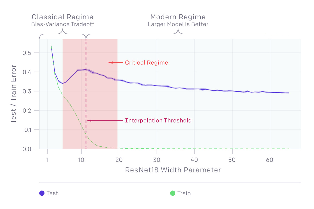 위 차트에서 보면 resnet모델 width크기가 커질 수록 test error가 커지는 구간(ciritical regime)이 존재한다는 것을 알 수 있다. 이 구간에서의 train error 추세와 대비된다.