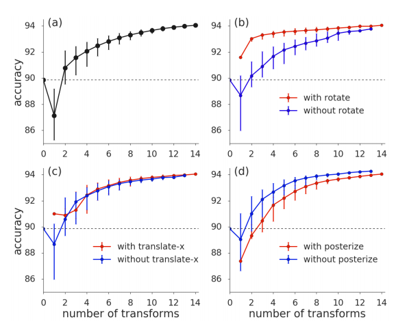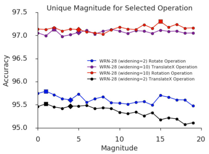 - 위 그래프에서 그렇지 않다라는 것을 보여줍니다. 14개의 op중 rotate, translate(shift) op의 mag만 변화시켰을 때 전체적인 acc변화양상을 보면 그렇게 차이가 나지 않음을 알 수 있습니다.