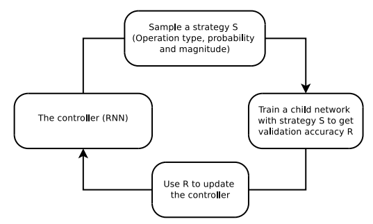 - RNN과 강화학습을 이용한 심플한 전략입니다. operation type, prob., magnitude 3가지를 최적화 합니다.