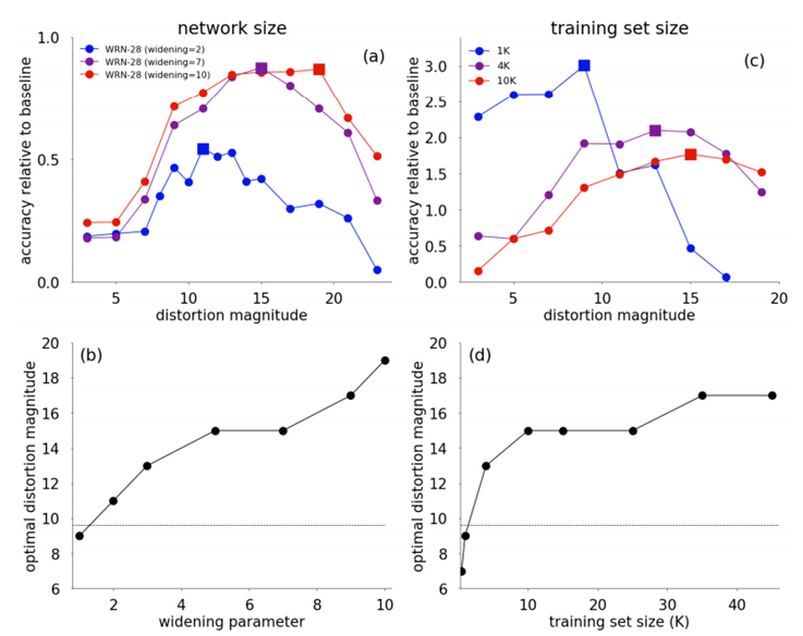 - 결론부터 말하면 여기서 모델의 data augmentation은 모델의 size와 학습셋의 size에 따른 최적 magnitude에 의존합니다.