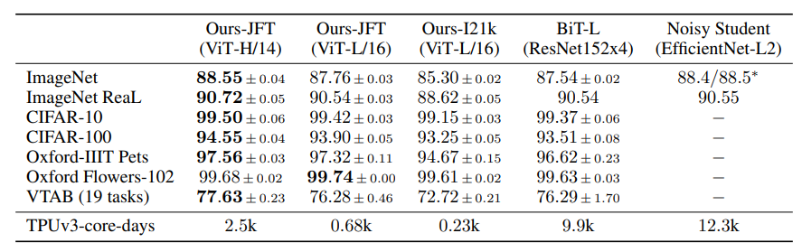 그 결과 best model은 ImageNet 평가에서 88.55% acc.를 달성할 수 있었다. 이밖에 ImageNet-ReaL 90.72%, CIFAR-100에서 94.55%, VTAB에서 77.63%를 기록했다